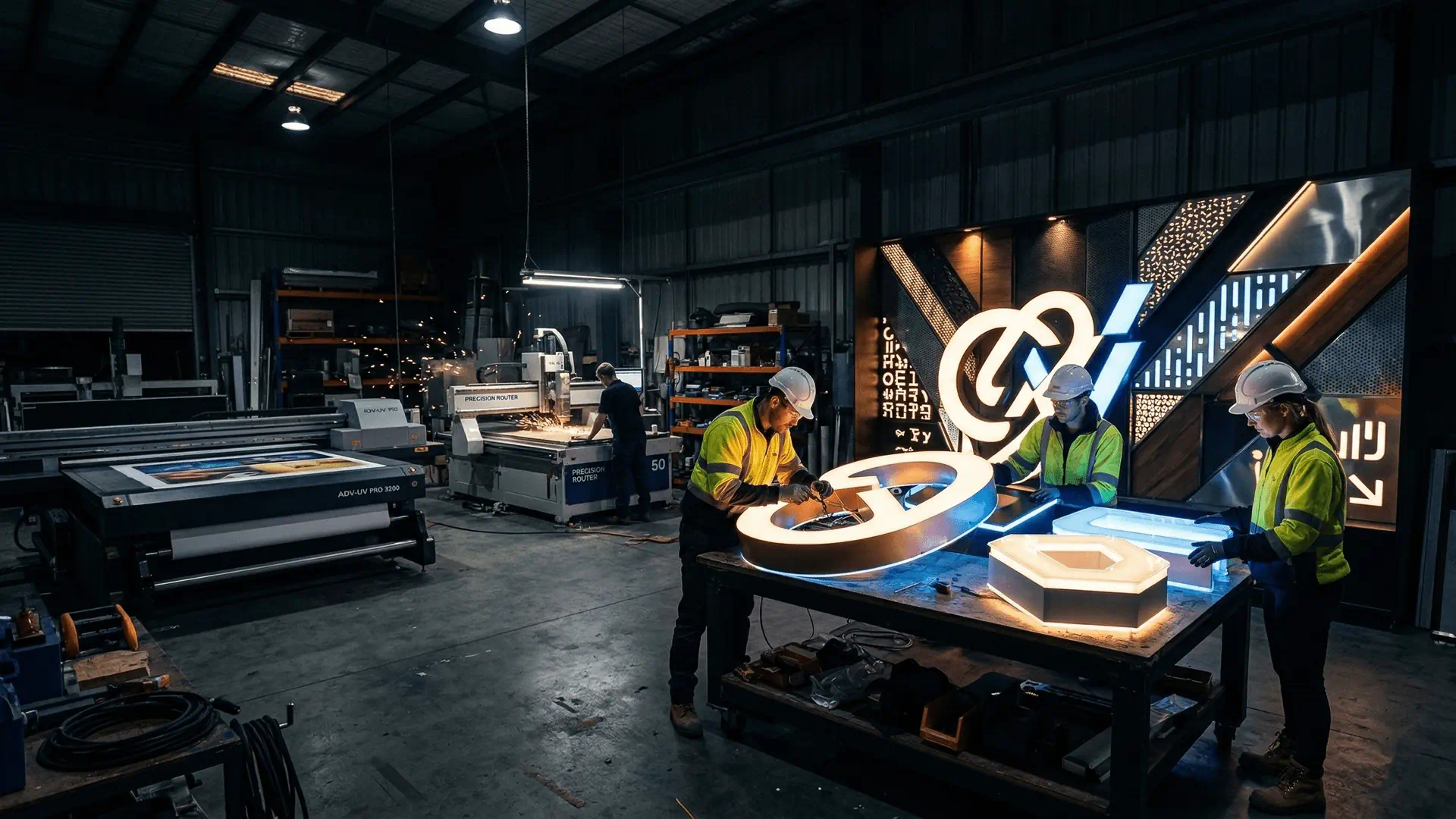 1500平米自有车间全天候运转。从数控切割到无尘烤漆,无论是高亮无边框的益阳灯箱还是复杂立体字,100%自有设备精工制造把控品质。